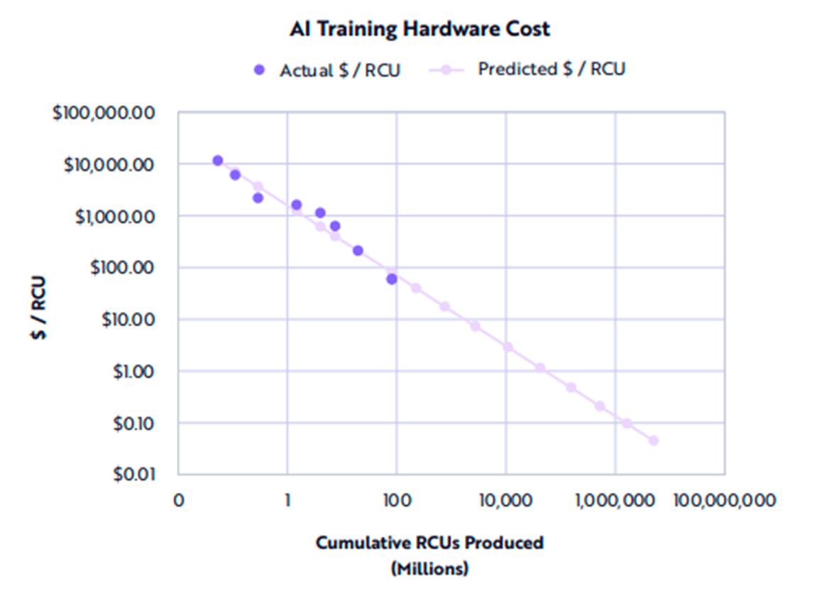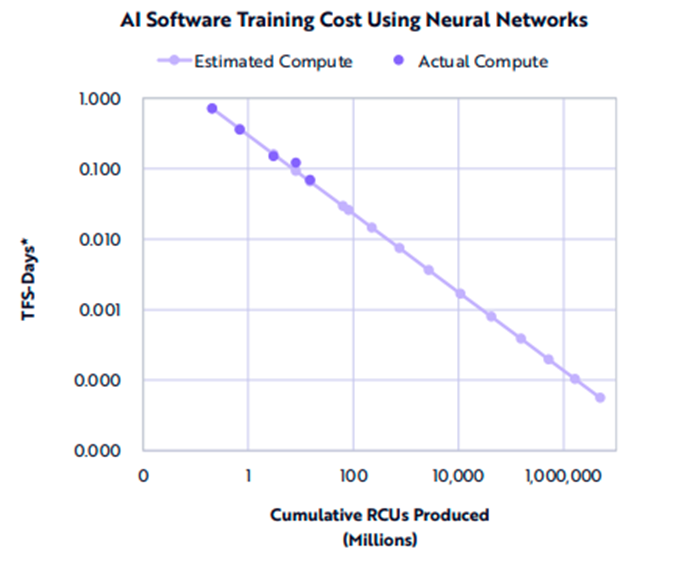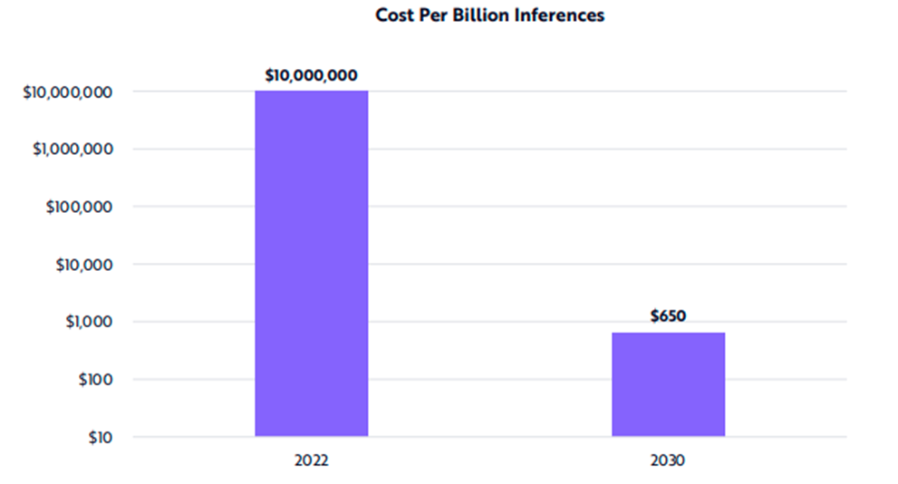 ARK also predicts that AI training hardware costs will decrease by 57% every year out to 2030: