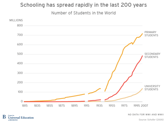 For thousands of years – most of human history – education was the privilege of a tiny elite. But today, most countries in the world recognise education not only as a right, but as a duty enshrined in law to ensure that all citizens attain a basic level of education. This expansion of education was especially pronounced over the last two centuries, during which the number of children attending primary school globally has grown from 2.3 million in the 19th century, to 700 million today, covering nearly 90 percent of the world’s school-age children.