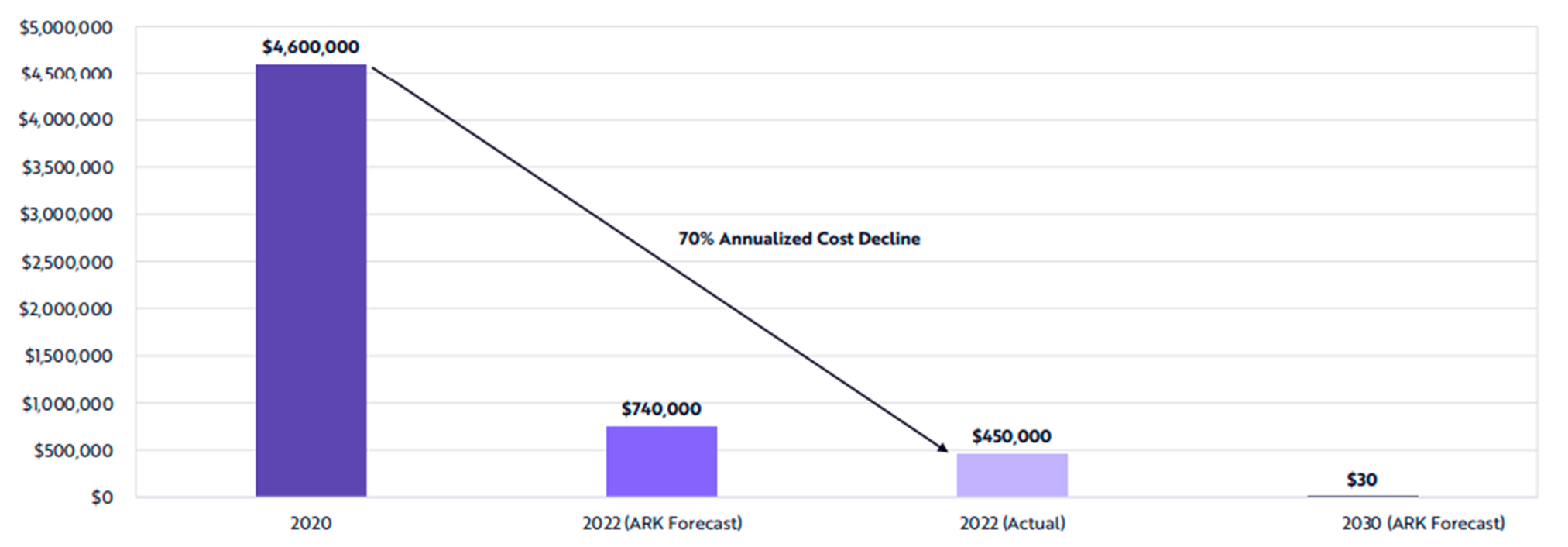 According to the ARK Invest Big Ideas 2023 report, training costs of a language model similar to GPT-3 performance fell by 70% per year from $4.6 million in 2020 to $450,000 in 2022. By 2030, the training cost of a GPT-3 level model will drop further to $30.