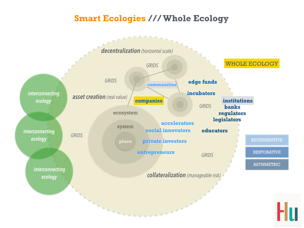 Here, a ‘whole ecology’ represents a ‘system of systems’ that can leverage each other’s capabilities to restore value in local economies, and can be replicated, with variance, across those systems.
