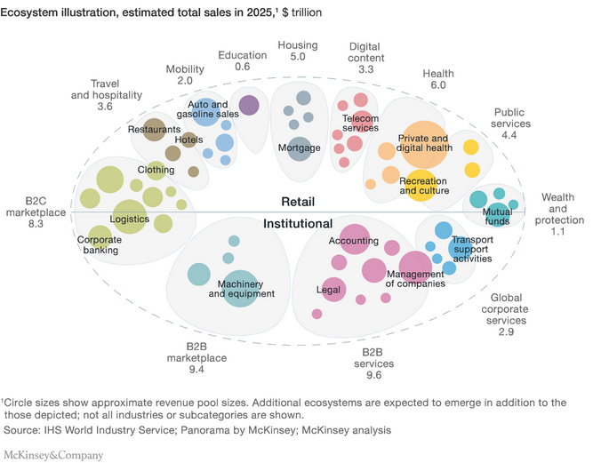 Traditional management consultancies, such as McKinsey, have rightly illustrated that vertical industries, as one example, are now ‘going horizontal’, such that supply chain infrastructures can actually share, and must share, resources, due to changing economic conditions. These are typically thought of as product or market ecosystems.