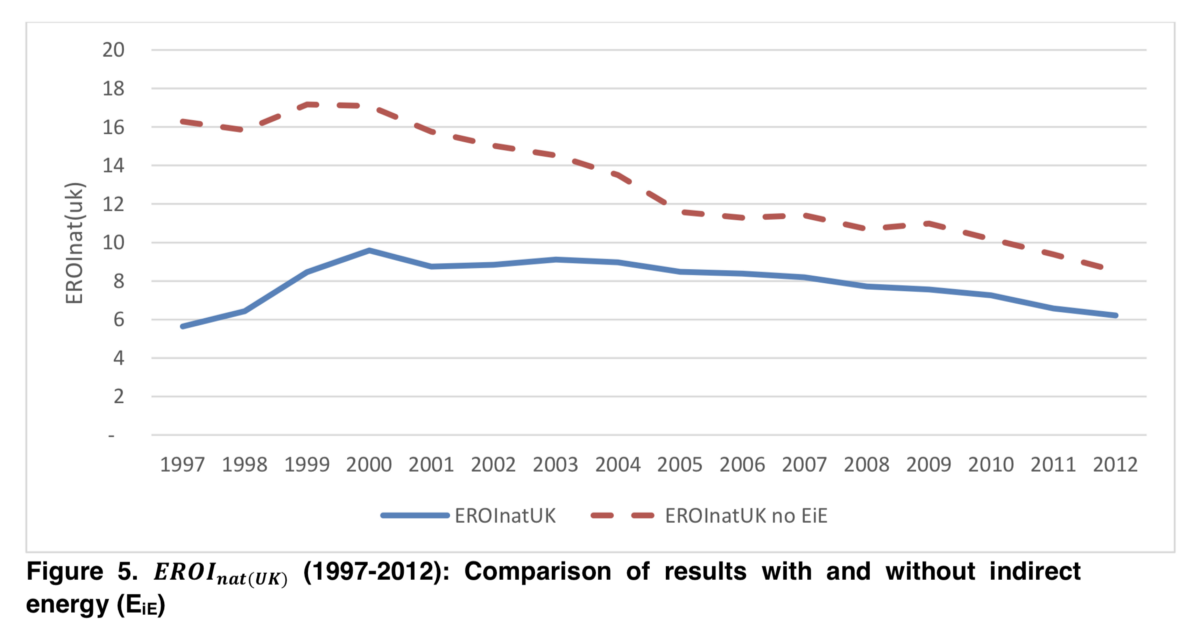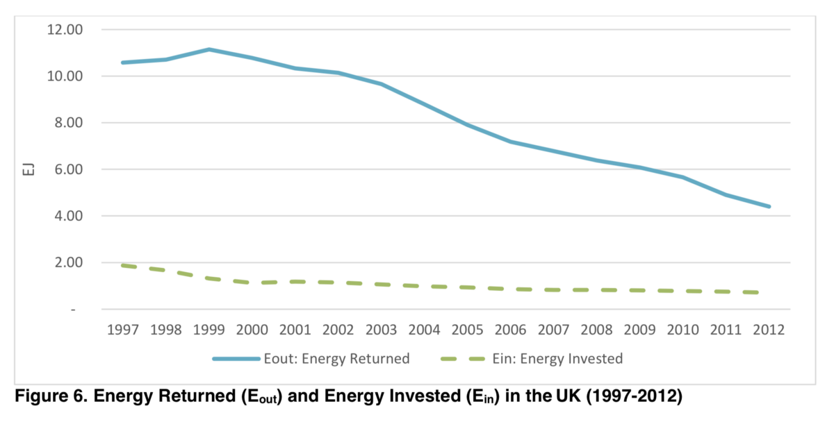 In January 2017, the Centre for Climate Change Economics and Policy run by the University of Leeds and London School of Economics, produced a startling analysis of Britain’s declining net energy problem. The study attempted to develop a methodology to examine national-level figures for Energy Return on Investment (EROI) — the amount of energy one uses to extract a particular quantity of energy.