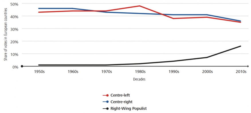 That process began around the 1960s, from when data on vote shares for centrist parties exhibits a consistent, gradual but accelerating decline that began to particularly take-off in the 2000s, accelerating further after 2010.
