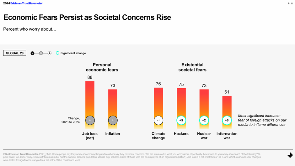 That trend is continuing to play out in different ways, but along the same broad trajectory of surprisingly fast decline, across the world. The 2024 Edelman Trust Barometer finds that global trust in governments, the media, scientists and NGOs is at its highest levels over 24 years – and as a result is even undermining public support for innovations and social change that may well be required to adapt to rapidly shifting economic and environmental conditions.