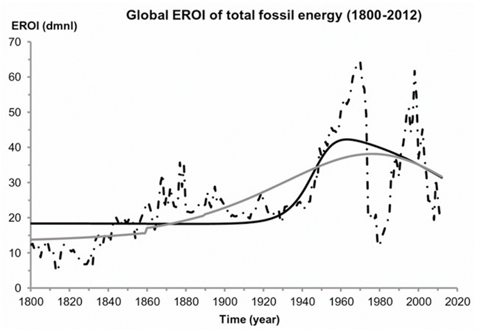 As one landmark study showed, the EROI of fossil fuels on a global scale appears to have reached an overall peak around the 1960s, following which it has experienced a steady decline. Although EROI studies can disagree on the exact chronology and scale of this process due to differing assumptions about how and where to measure energy inputs and outputs in various energy systems, they have offered an unmistakeable consensus that the EROI of fossil fuels has increasingly declined over the last few decades, and will continue to do so.