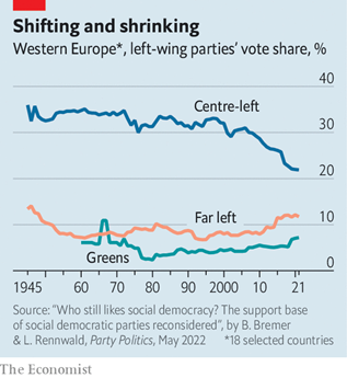 The below data from The Economist demonstrates specifically how the centre-left overall has seen its popularity wane increasingly in this time-frame, making more room (yet only marginally so) for far left and green parties.