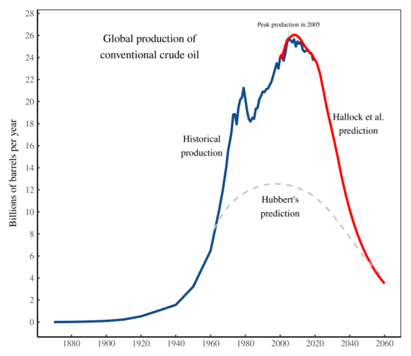According to Toronto-based political economist Dr Blair Fix, the current plateau and decline of conventional oil production has closely tracked a peer-reviewed model produced by Dr John Hallock Jr of the New York State Department of Transportation.