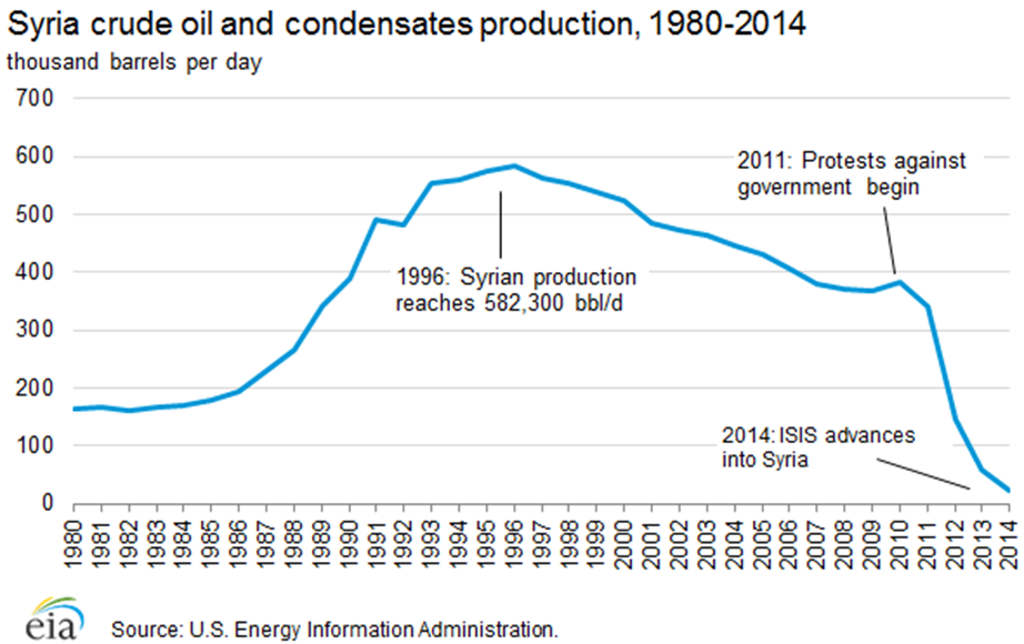 From 2001 to 2009, Syria’s oil production had declined by a third from 581,000 barrels per day (bpd) to 375,000 bpd. The decline had started around 1996, when its conventional oil production had peaked.