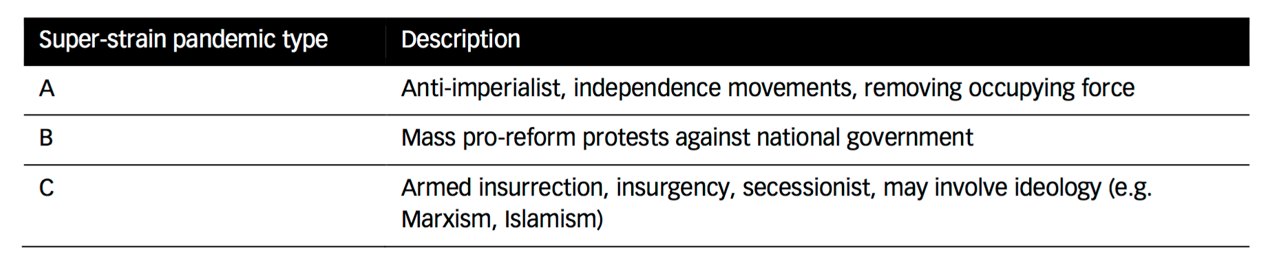 The final “super-strain pandemic” is “armed insurrection” or “insurgency” and is associated with two particular ideologies, “Marxism” and “Islamism.”