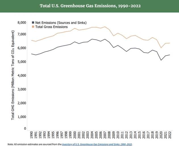 US net emissions declined 15 percent from 2005 to 2021 due to a range of market- and policy-related factors. Electric power sector emissions fell 36 percent (through 2021) as a result of a shift from coal to natural gas, increased use of renewable energy, and a leveling of electricity demand.
