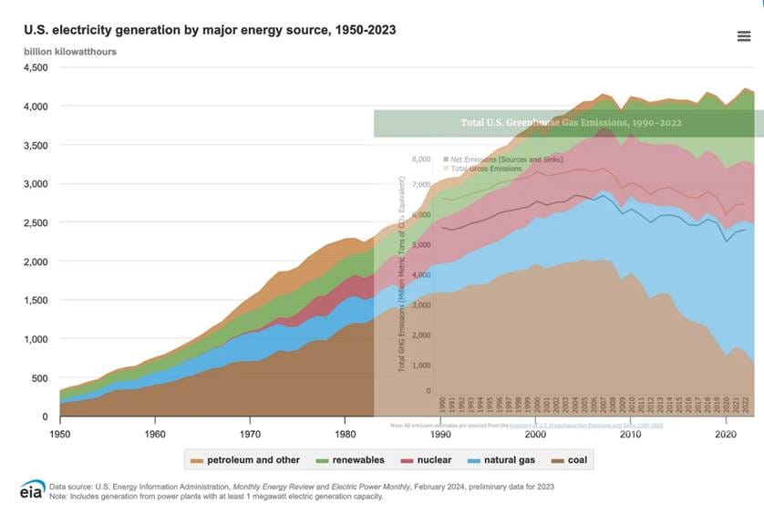 This is a misinterpretation of the graph, which illustrates precisely the impact of the energy transition. Contrary to Donald’s assertion, electricity generation is increasing in this period, but the composition of the US energy system is changing dramatically.