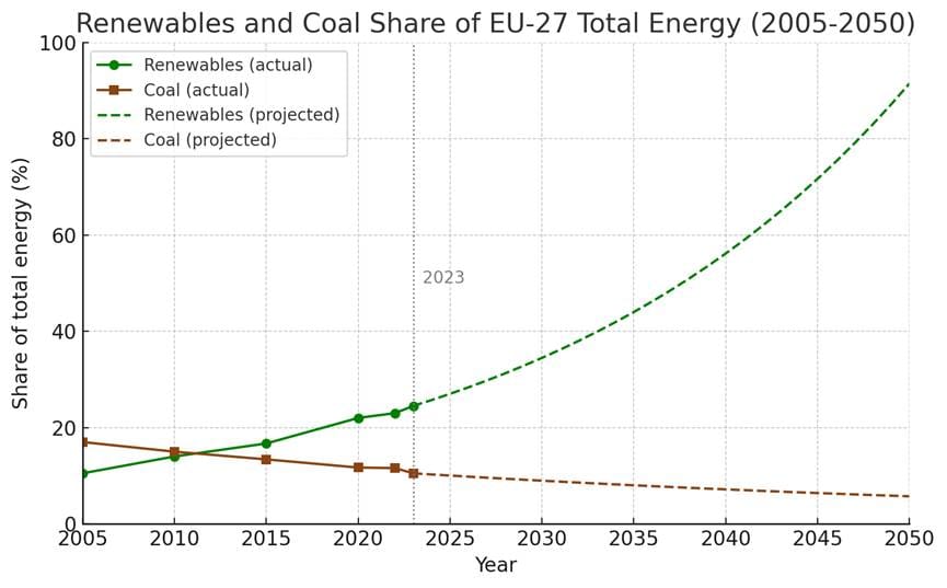 This is likely a conservative projection. Coal’s steady decline is projected as relatively slow. In reality the amplifying feedback effects between the growth of renewables and the decline of coal are not represented here. Those feedback effects mean that as renewables scale, they will increasingly take up the demand previously met by coal and therefore accelerate the decline of coal. But even if that system dynamic is ignored, the simple projection above demonstrates that renewables are on track to dominate the EU energy system by mid-century.