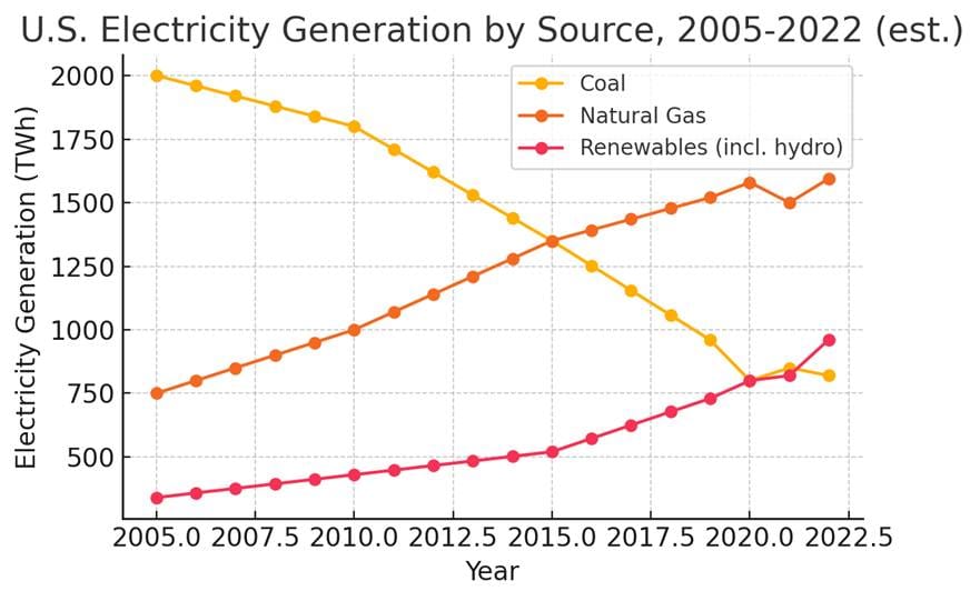 Overall, the data show that natural gas was the primary direct replacement for coal in the 2005–2015 period; but from 2016-2025, renewable energy has taken on a growing role in replacing coal especially in the last 8 years. This trend is expected to continue as wind and solar capacity rapidly expand. Donald's blanket insistence that “renewables have not replaced coal” is therefore just not true – while gas shouldered most of the load initially, renewables by 2023 have significantly eaten into coal’s share and are now displacing coal generation at scale.
