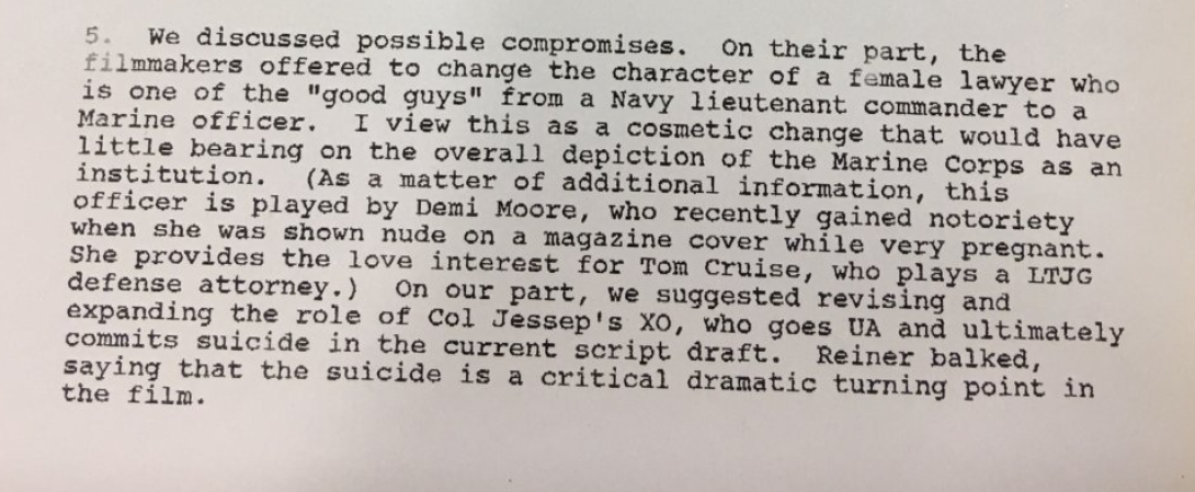 Later memos outline the DOD’s specific objections: they perceived most of the Marines in the film as negative portraits; they objected to Navy characters saying ‘hours’ when referring to times (e.g. ‘ten hundred hours’) as ‘this is an Army way of telling time, and most onerous’; they disagreed with Tom Cruise’s character complaining about having to wear Navy whites; and they couldn’t see who were the ‘Few Good Men’ in the film. The Pentagon also weren’t fans of Demi Moore who, one memo notes, ‘recently gained notoriety when she was shown nude on a magazine cover while very pregnant.’