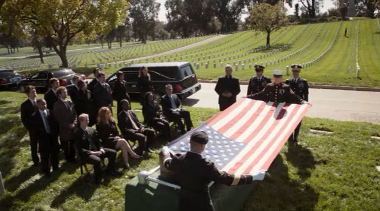 The episode centres around the decade-old remains of a veteran who had fought in Operation Desert Storm and, by bizarre coincidence, was protesting outside the Pentagon on 9/11. He was injured in the plane crash but heroically rescued three people trapped in the rubble, before succumbing to his injuries several days later. The Bones team figure this out through the course of the episode and then the veteran is given a full military funeral at Arlington National Cemetery.