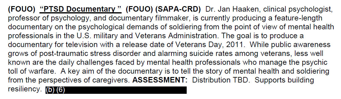 Using documents obtained under the Freedom of Information Act, along with files from a newly-opened archive in Georgetown, I investigated the Pentagon’s approach to projects that feature or reference military PTSD and suicide. I found that the DOD has repeatedly censored and refused to support films, TV shows and documentaries that feature military suicide, and tends to only support those projects that make it look like the DOD is solving the problem.