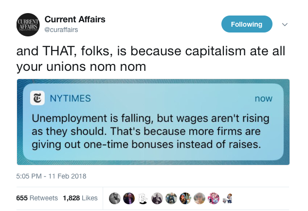 After successful neoliberal attacks on unions, workers are subdued further through these changes, receiving a decreasing portion of pay amidst record profits for corporations. In both the US and the UK this has resulted in falling unemployment, but stagnant wages and increasing in-work poverty.