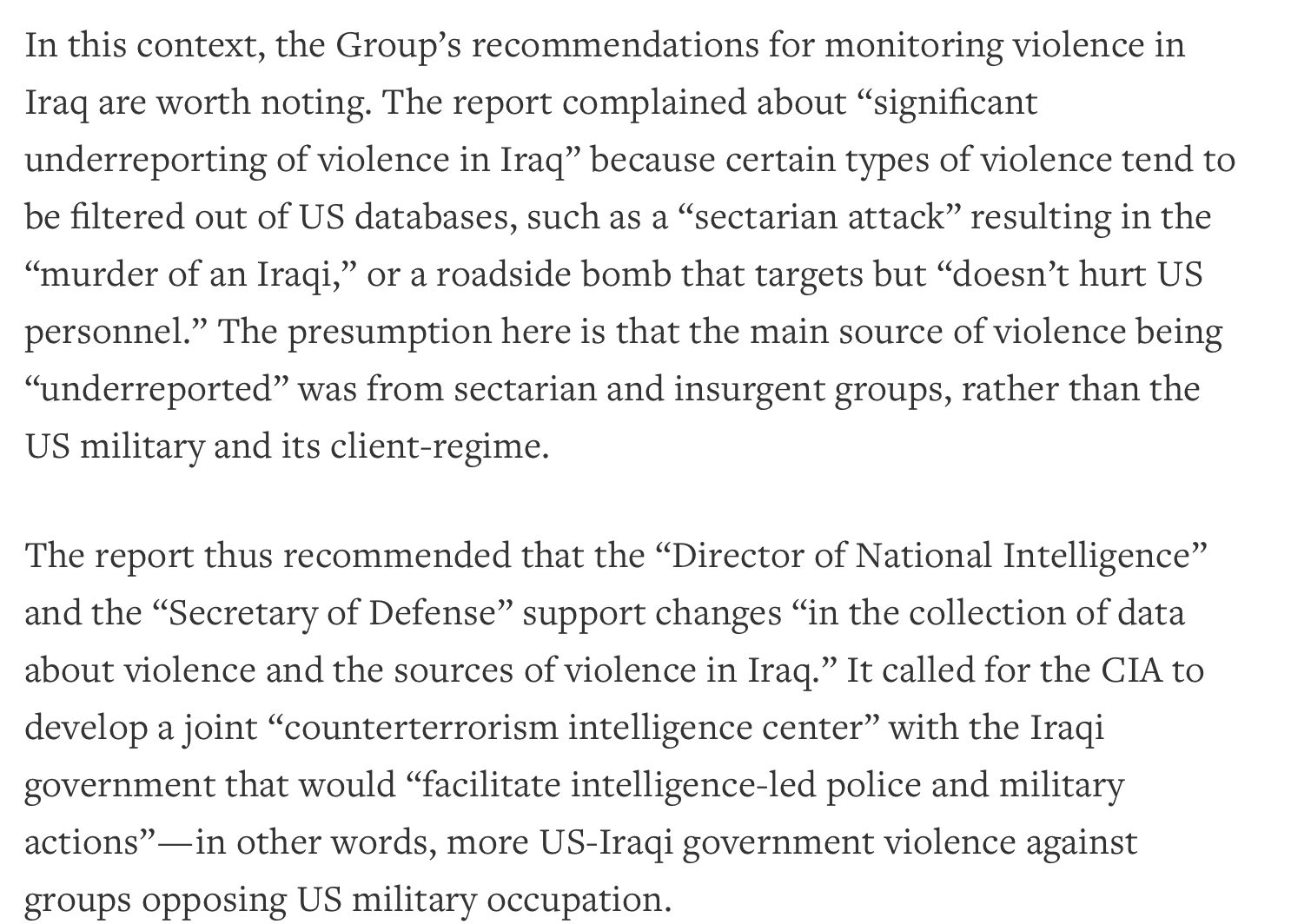 “This is clear empirical evidence of USIP’s ideological bias on the issue of casualty counting and responsibility for violence in Iraq. For USIP, attacks on US soldiers were being insufficiently counted, US violence in Iraq against Iraqi citizens did not meaningfully exist — and more focus needed to be placed on sectarian violence in Iraq as a cause of violent deaths.”