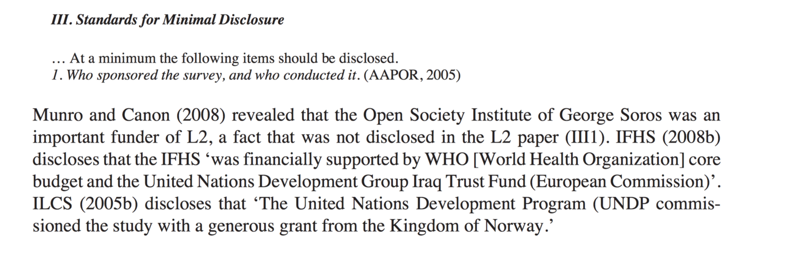 Ahmed … seems fairly outraged himself — particularly when he accuses the “IBC-affiliated” Michael Spagat of repeating a “falsehood” about the OSI funding. (Spagat had merely mentioned that “Munro and Canon [2008] revealed that the Open Society Institute of George Soros was an important funder of L2, a fact that was not disclosed in the L2 paper”).