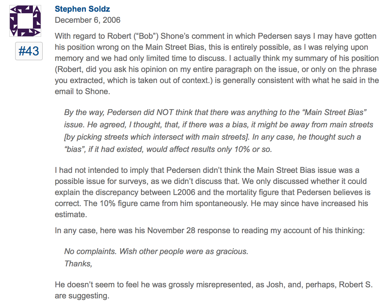 1) I very much agree with the MSB-team that there is some main stream bias, and that this is certainly an important problem for many surveys — not only the Iraq Lancet one. 2) I am unsure about how large that problem is in the Iraq case — I find it difficult to separate that problem from a number of other problems in the study. A main street bias of the scale that we are talking about here, is very, very large, and I do not think that it can be the sole culprit. 3) The MSB people have come up with some intriguing analysis of these issues.” (Jon Pedersen, email to Robert Shone, 4/12/06)