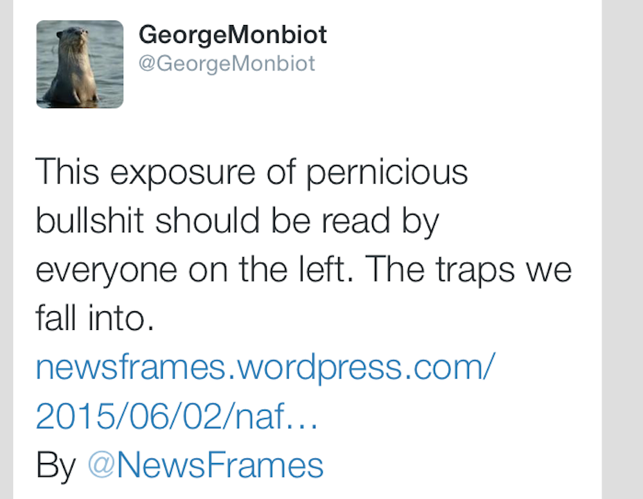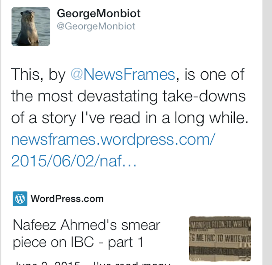 Dean will not accept any criticism of IBC. IBC is basically God. Everyone who critiques IBC is engaged in ugly smearing and misleading rhetoric. Dean’s imaginary “hero” versus “villain” narrative is a frame of his own construction, not mine. IBC is the hero, and I’m the villain, hell-bent on attacking poor innocent IBC. And thankfully, Sir George Monbiot has waded in on Twitter to valiantly come to the aid of his friends.