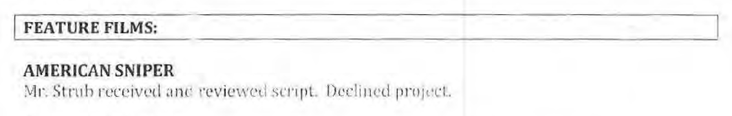 Similiarly, American Sniper (2014) was produced with no government support, despite being based on the autobiography of highly-decorated military sniper Chris Kyle. The Navy were approached in 2013 when Steven Spielberg was attached to direct but after DOD Hollywood liaison ‘Mr Strub received and reviewed script’ he ‘declined [the] project’. There were no script negotiations and no input from the entertainment liaison offices.
