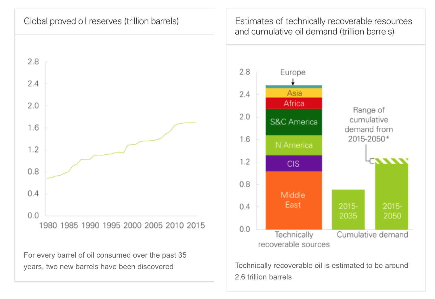 According to BP, the world is swimming in oil. With abundant technically recoverable resources, oil supply is not going to run low anytime soon.