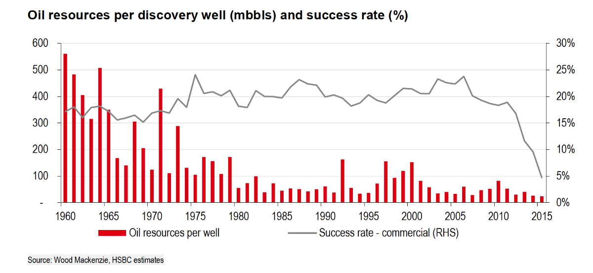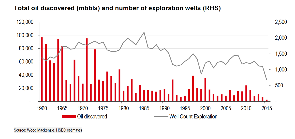 HSBC emphasises a different reality: that the actual quantity of oil discoveries is dramatically decreasing year by year, and rapidly reaching a point at which the amount of new oil we’re discovering is becoming negligible, for all intents and purposes.