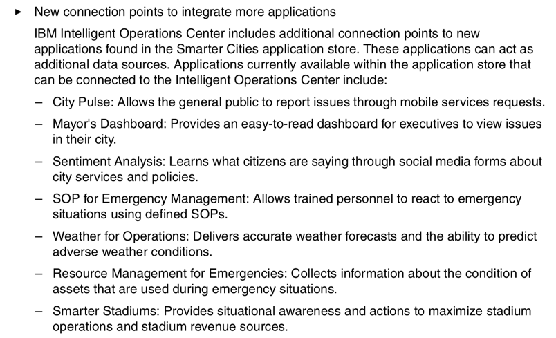 Sources of data include feeds from “weather, citizens, law enforcement, social welfare, video”, and the document identifies a number of applications which administrators can connect to the Center from an in-built store, including: “Sentiment Analysis: Learn what citizens are saying through social media forms about city services and policies.”