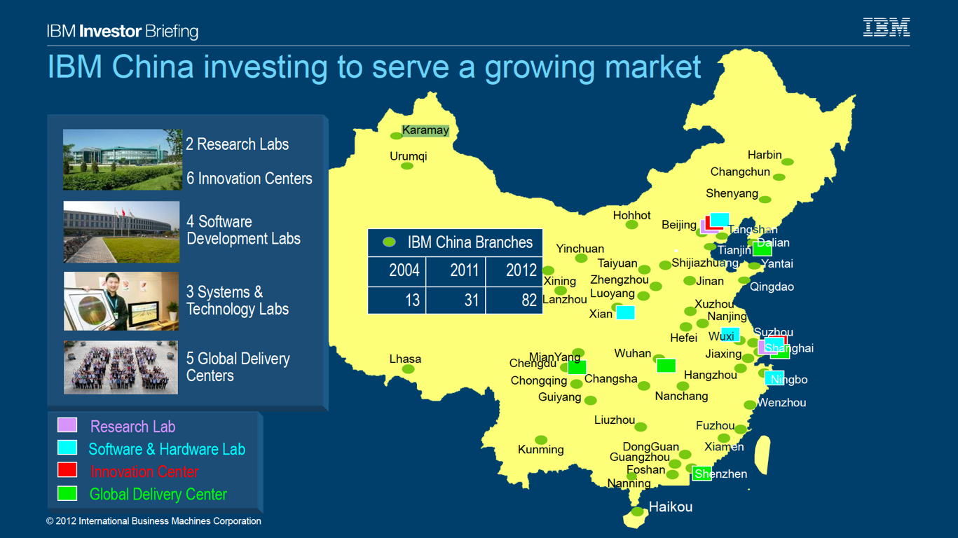 According to a 2012 IBM investor deck titled ‘Smarter Cities’, the company had established 82 IBM branches across the country encompassing research, innovation, and software development — including in Xinjiang’s emerging ‘smart city’ of Karamay. The document described IBM’s unique capabilities in China as involving “smarter cities”, “business analytics”, the “cloud” and “smarter commerce”.