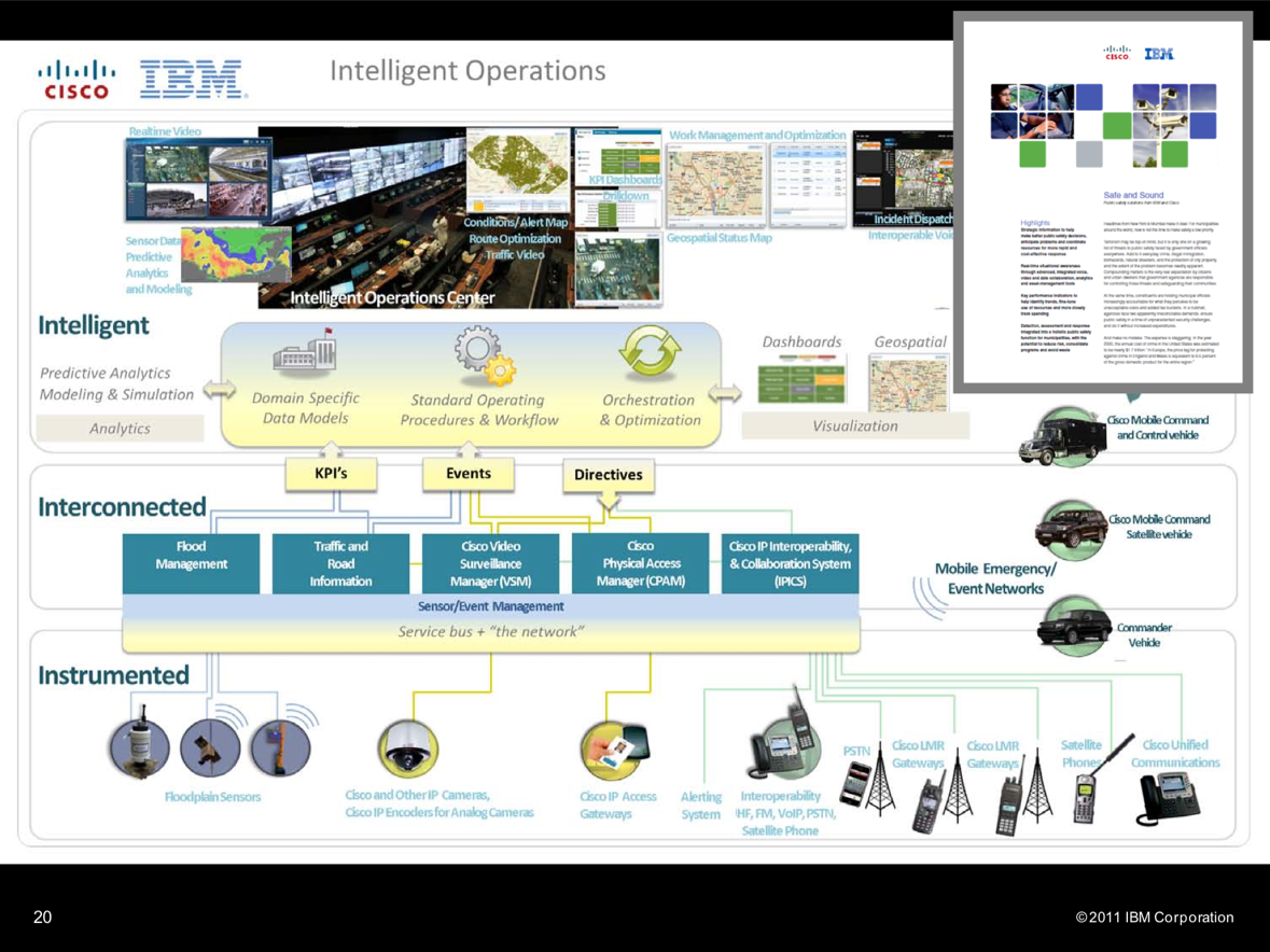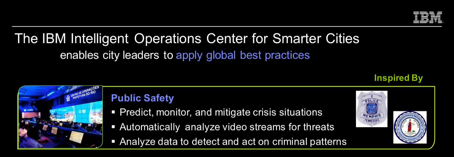 This represented fairly staple thinking on behalf of IBM’s ‘smarter planet’ vision. An IBM presentation deck from 2011 published on the Cisco website repeatedly mentions “public safety” as an integral component of IBM’s ‘smarter planet’ vision.