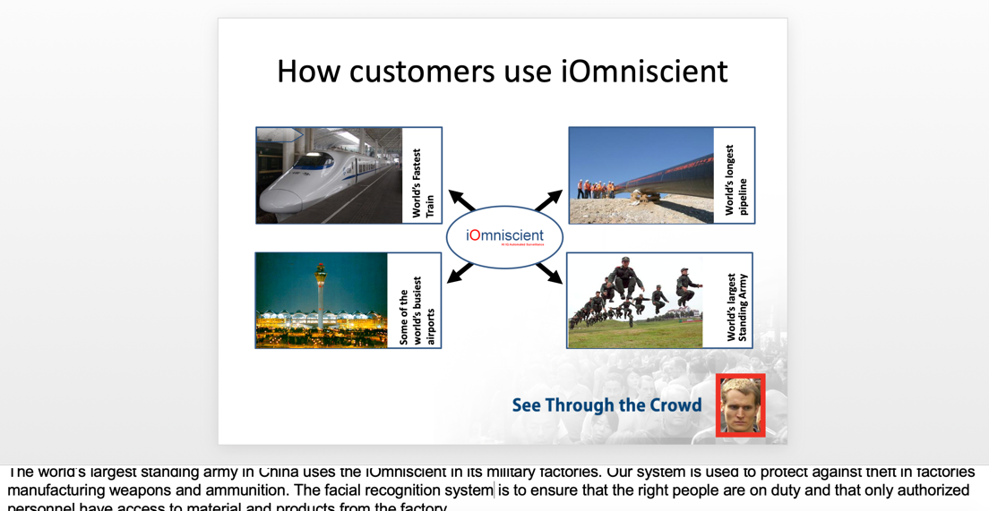 “The world’s largest standing army in China uses the iOmniscient in its military factories,” reads an iOmiscient company and product presentation deck. “The facial recognition system is to ensure that the right people are on duty and that only authorized personnel have access to material and products from the factory.”
