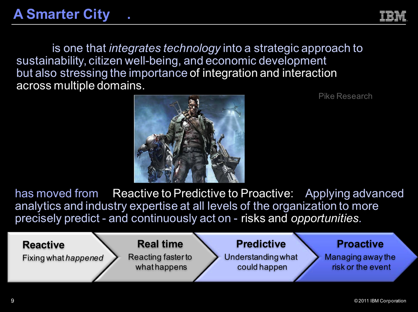 Apart from a bizarre slide describing how smart cities shift from “reactive to predictive to proactive” approaches — featuring an image of The Terminator no less — the IBM deck also mentions the importance of “fusion and real-time analysis of information for public safety” and “digital video surveillance to protect public buildings and the transportation infrastructure and to protect citizens in public area.”