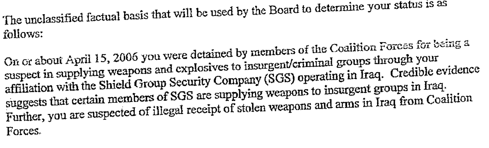 “… suspected of supplying weapons and explosives to insurgent/criminal groups… Credible evidence suggests that certain members of SGS are supplying weapons to insurgent groups in Iraq.”