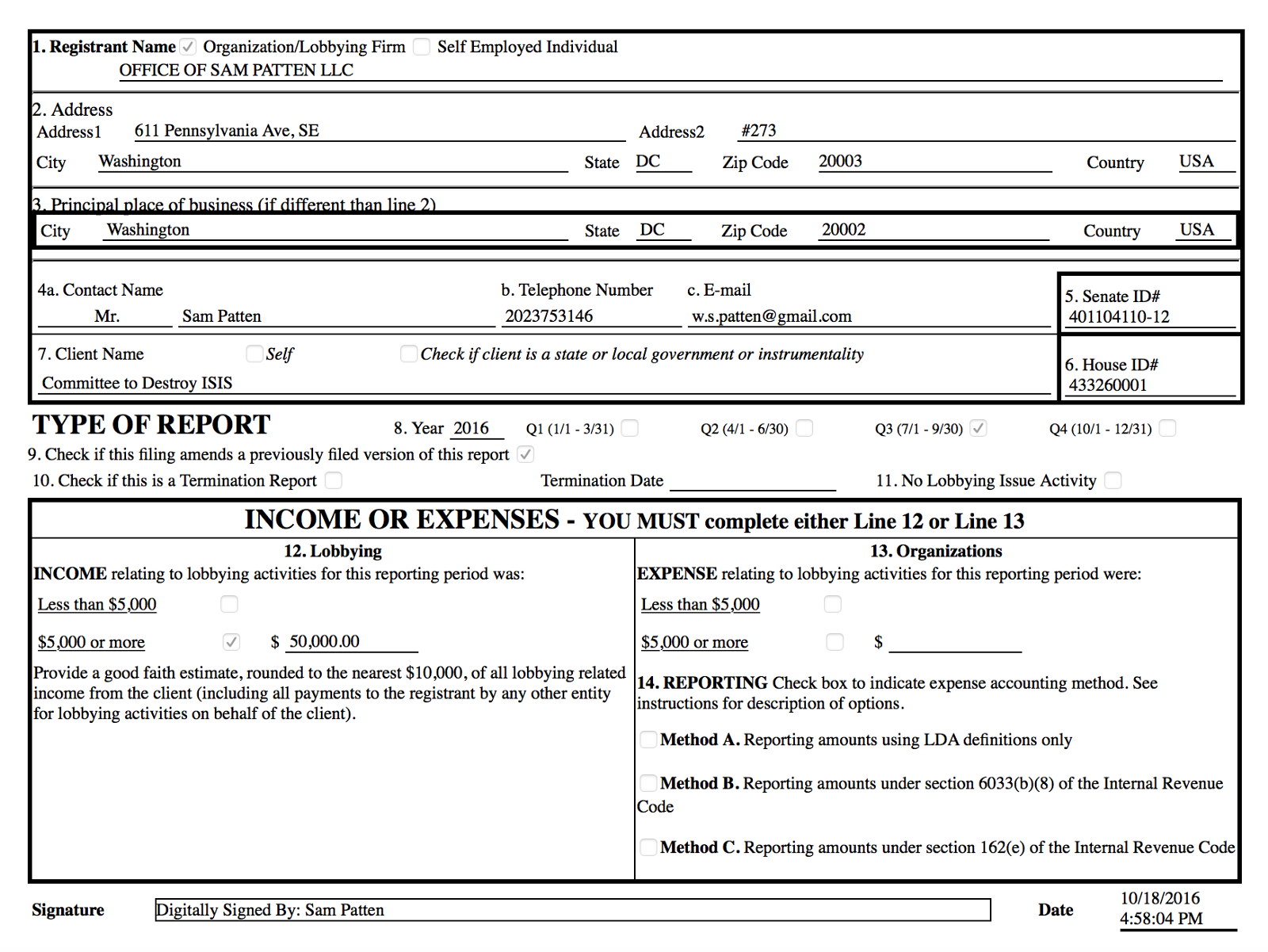 The locus of the activity is an organization called the Committee to Destroy ISIS, set up in July 2016 by Sam Patten.