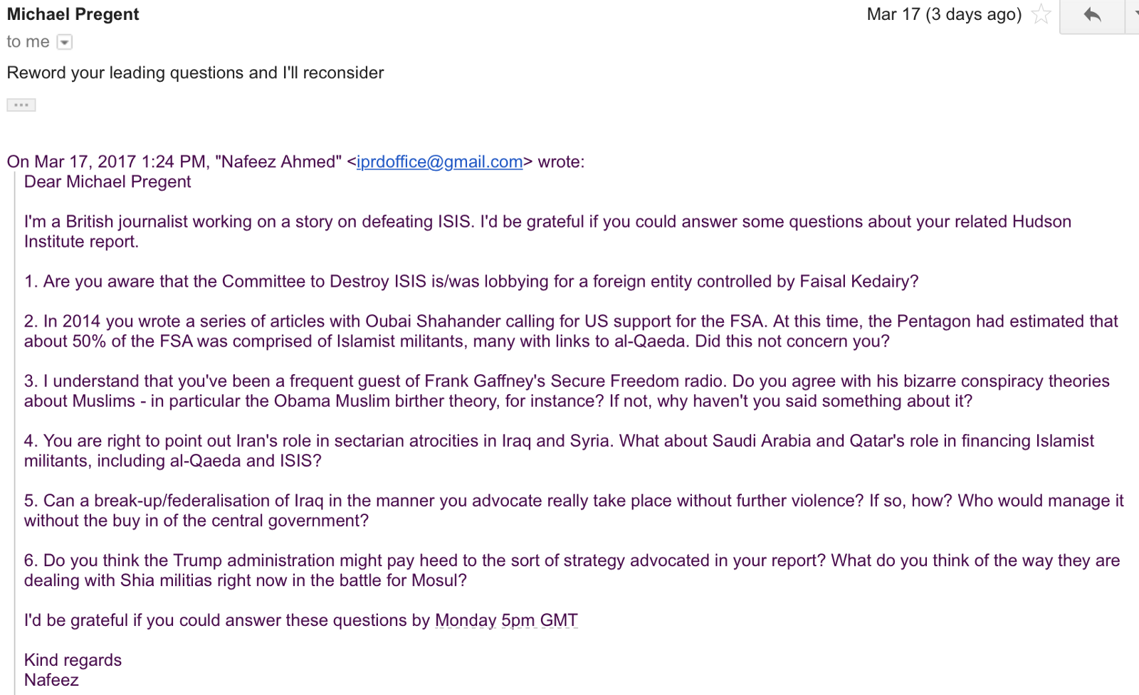 Unfortunately, Pregent declined to answer any questions at all in relation to this story. “Reword your leading questions and I’ll reconsider”, wrote the former intelligence officer in response to a list of questions.