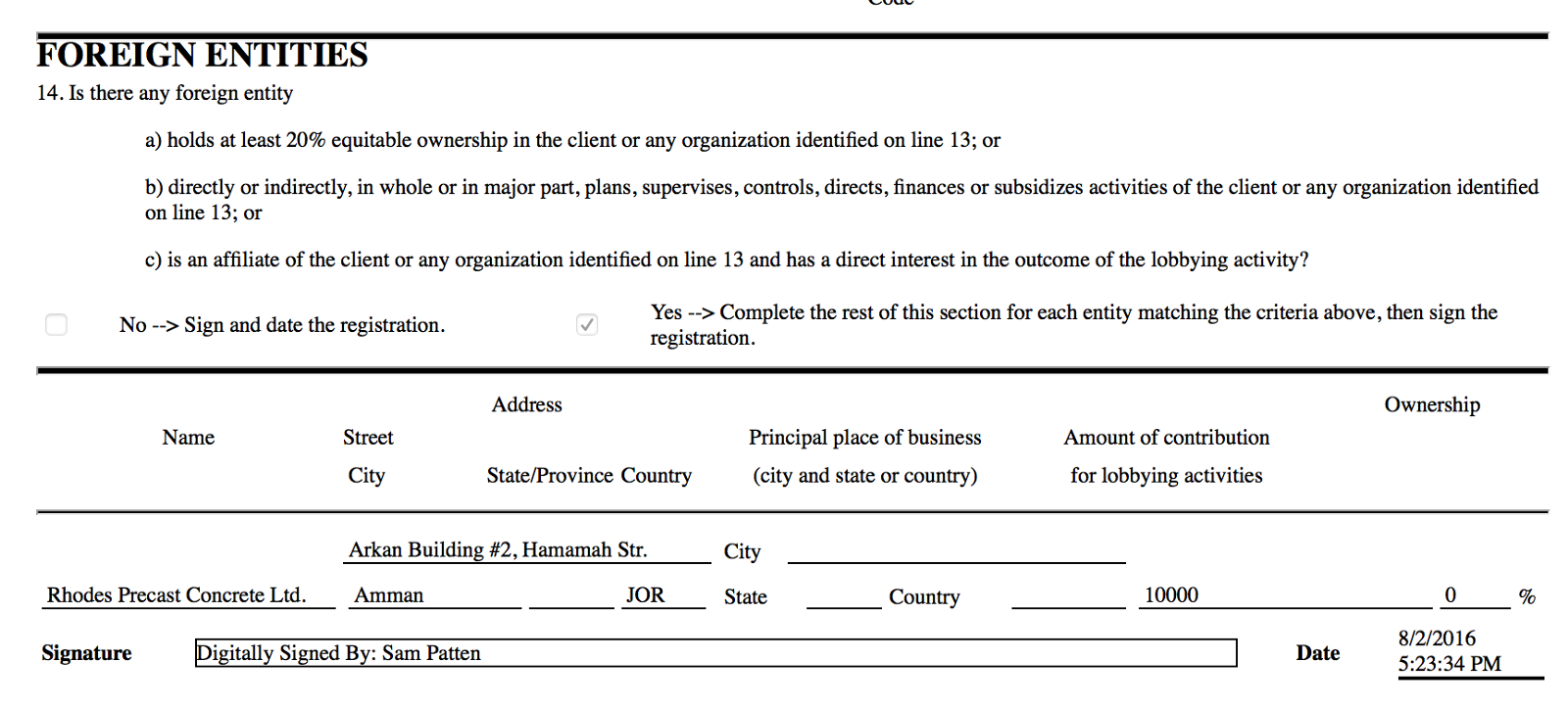 The first filing, filed and signed by Patten in August 2016, reveals that the Committee is majority-owned by a foreign entity listed in the disclosure form as “Rhodes Precast Concrete Ltd.” The documents show that Patten is essentially acting as a lobbyist for this “foreign entity.”
