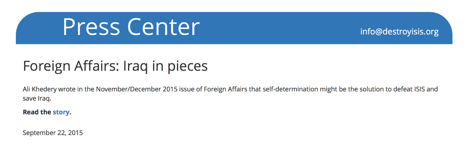 The Committee’s ‘Press Center’ highlights Khedery’s article in the December 2015 issue of Foreign Affairs, ‘Iraq in Pieces: Breaking Up to Stay Together’, calling for the “self-determination” of the western Sunni portion of Iraq.