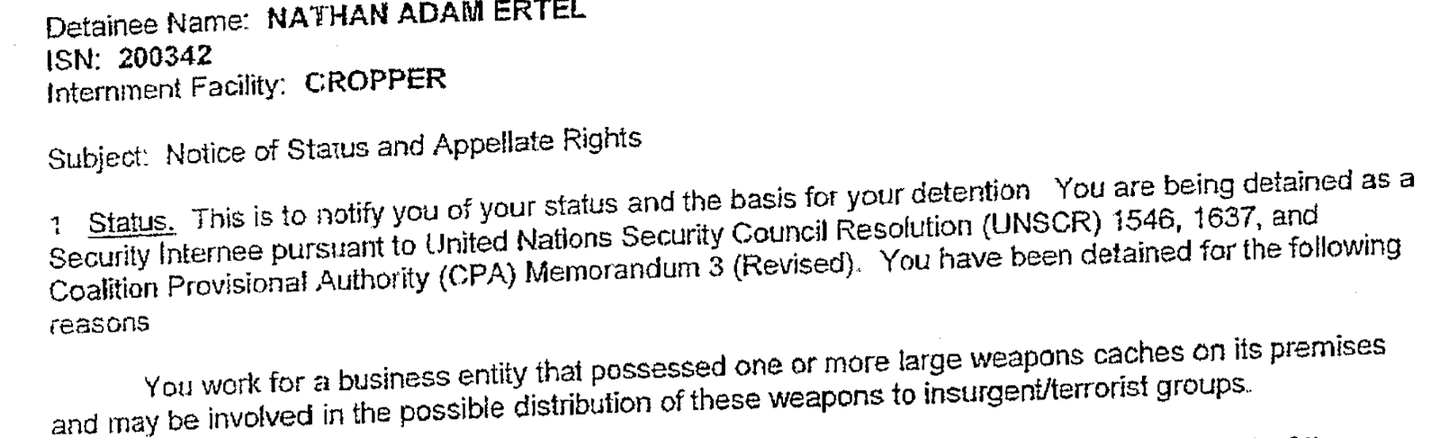 Similarly, a Magistrate Form for Ertel’s detention at Camp Cropper in Baghdad, Iraq, from the Department of Defense’s Legal Office — Task Force 134, dated April 22, 2006, described SGS as a “business entity” harboring a large cache of weapons that “may be involved in the possible distribution of these weapons to insurgent/terrorist groups.”