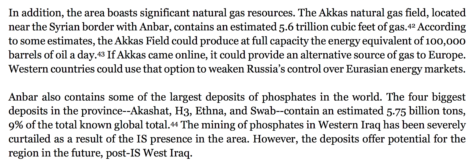 The Akkas field’s 5.6 trillion cubic feet of natural gas, wrote Pregent, could produce the equivalent of 100,000 barrels of oil a day, which might be used to supply Europe and wean the continent off dependence on Russian energy imports. Nearby Anbar — which lies at the heart of the insurgency — contains nearly a tenth of the world’s total phosphates deposits.