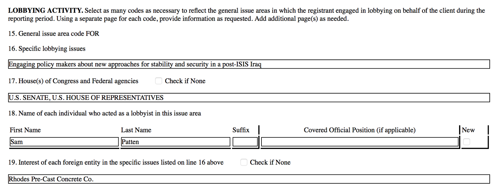 The second document, filed in October 2016, identifies “Rhodes Precast Concrete Co” as a foreign entity interested in lobbying policymakers “about new approaches for stability and security in a post-ISIS Iraq”.