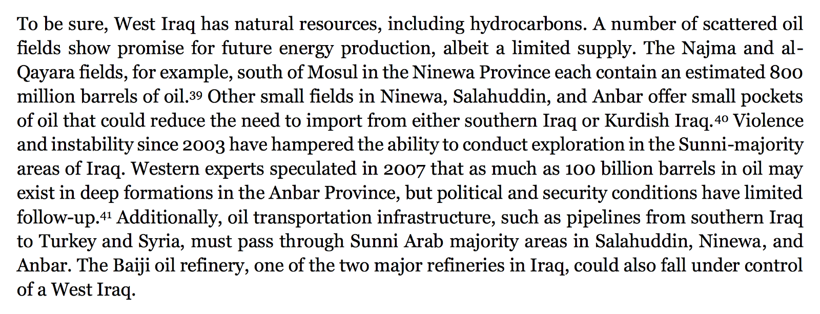 “Western experts speculated in 2007 that as much as 100 billion barrels in oil may exist in deep formations in the Anbar Province, but political and security conditions have limited follow-up.” [emphasis added]