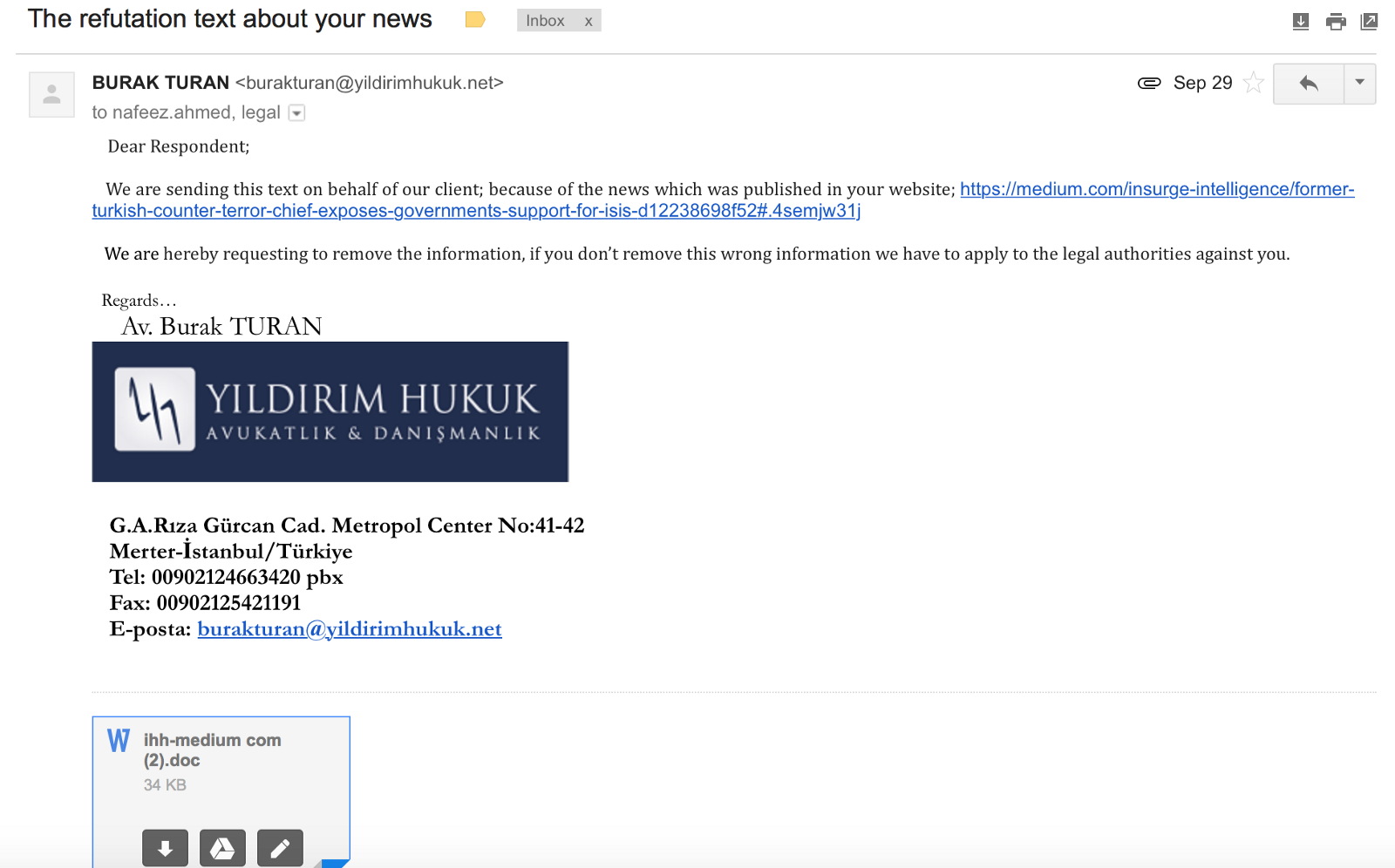 But on 29 September, I received an email from a Turkish law firm based in Istanbul, Yilidirm Hukuk, on behalf of IHH. The firm demanded that my article interviewing Yayla be immediately removed.