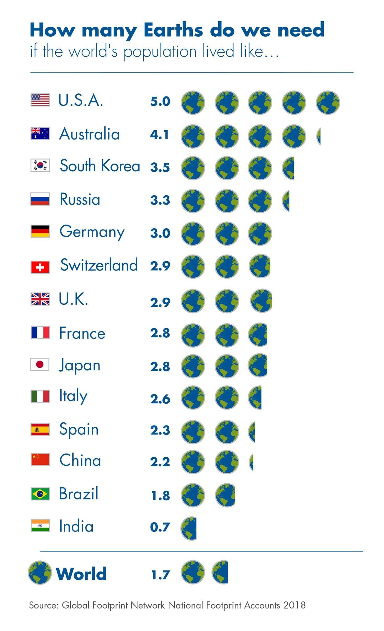 Take a closer look at the ‘Overshoot Day’ of individual countries. This measure indicates when the world would reach overshoot if everyone on planet Earth consumed and generated waste like the average citizen of that particular country.