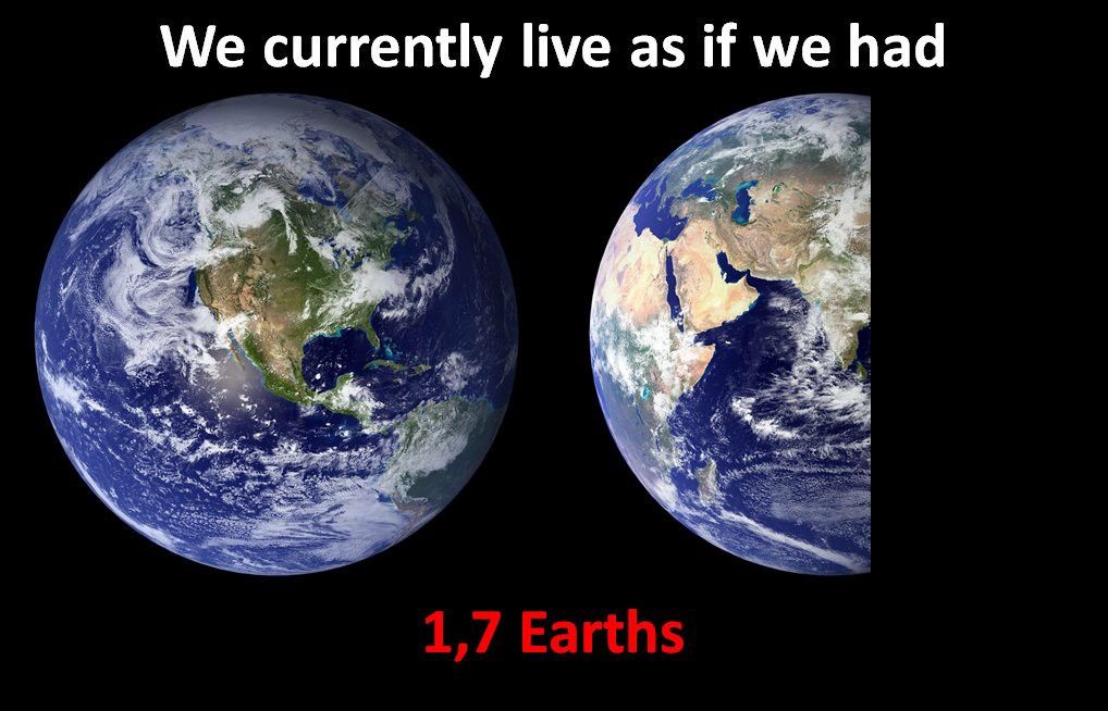 Another way of looking at this data is to say that currently humanity is using resources and generating waste in such excess that we are living off 1.7 planets. The snag being that this is clearly not something that can continue.The longer we do so, the less capacity for bio-productivity will remain, as we erode planetary life support systems even further.