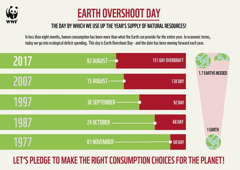 In other words, this the day that we started to erode the capital of the inheritance of life, rather than thriving together by living off its interest and staying within a resource use that is below the amount the Earth is able to regenerate every year.