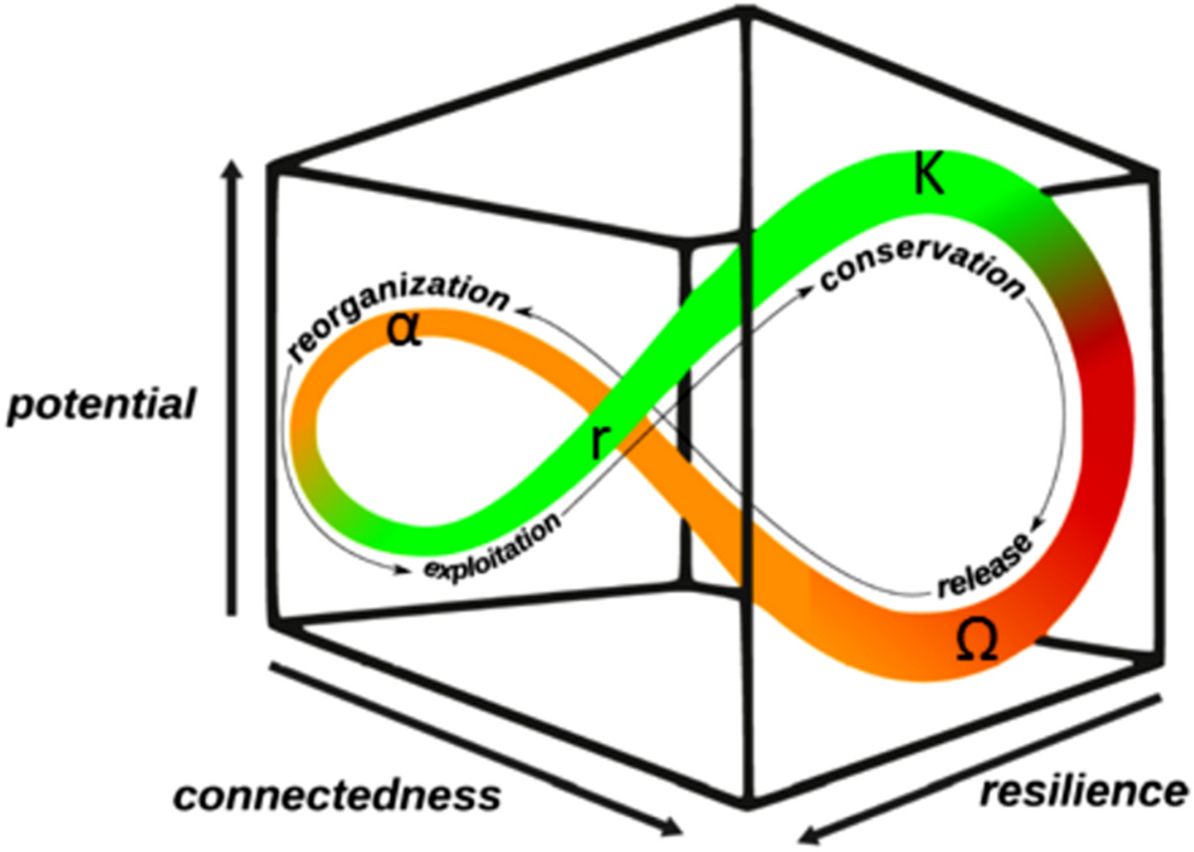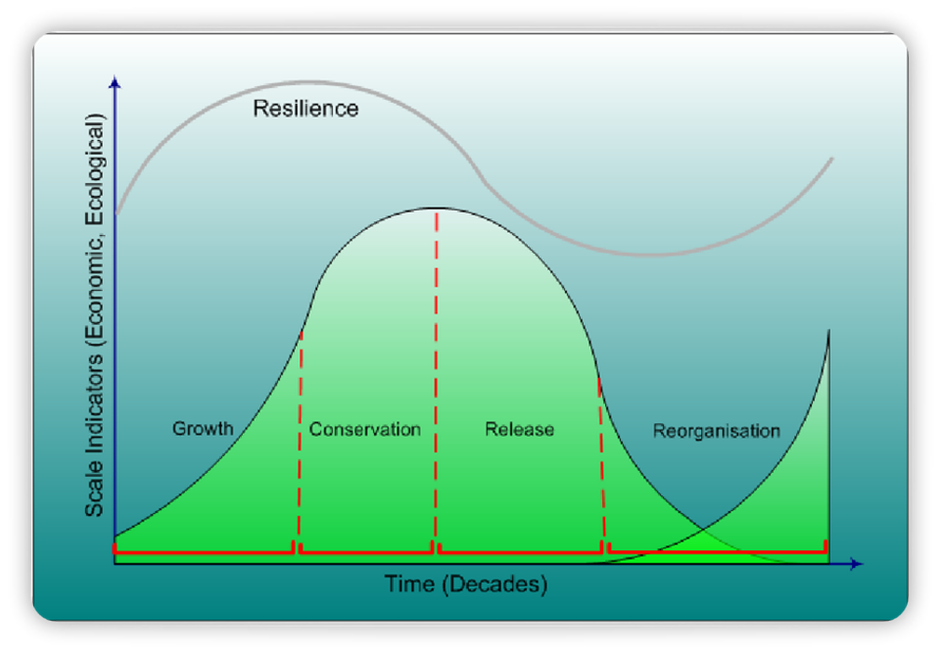 Holling found that all ecological systems experience a life cycle which goes through four stages: growth, conservation, release, and reorganisation. Holling called this the ‘adaptive cycle’.