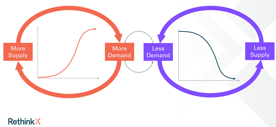 Waves of technology growth and decline follow the same pattern as Holling’s adaptive cycle. While the emerging technology experiences exponential improvements in cost, efficiency and performance, the incumbent technologies experience the opposite: escalating costs, declining efficiency, dwindling performance, which culminate in diminishing returns and deteriorating competitiveness.
