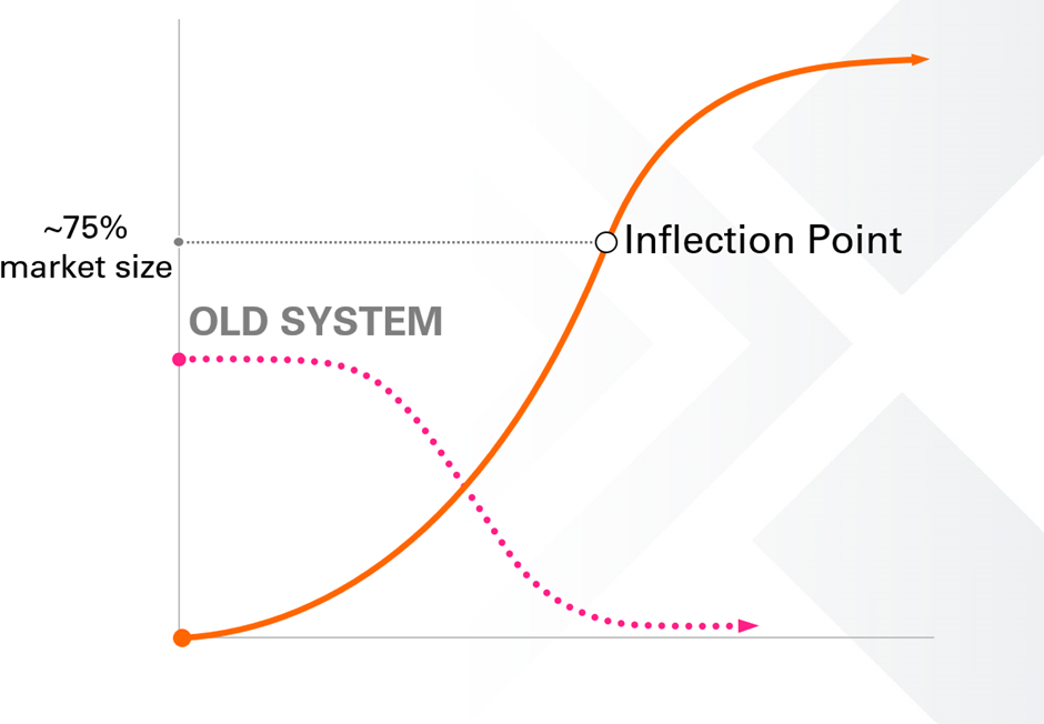When the decline curve mapping the collapse of the old system is superimposed on the S-curve mapping the birth of the new system, it looks like an X.