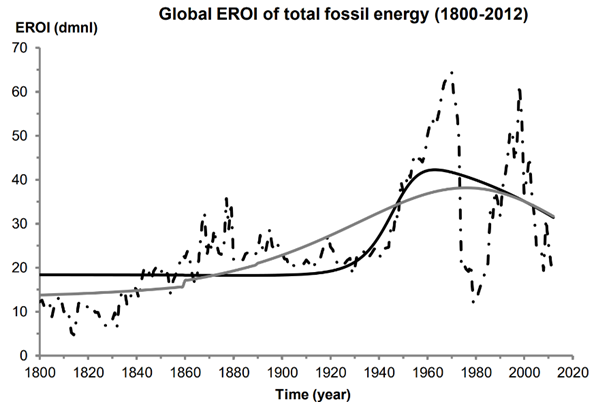 Numerous studies have shown that the EROI of global fossil fuels peaked around the 1960s and is now in terminal decline.